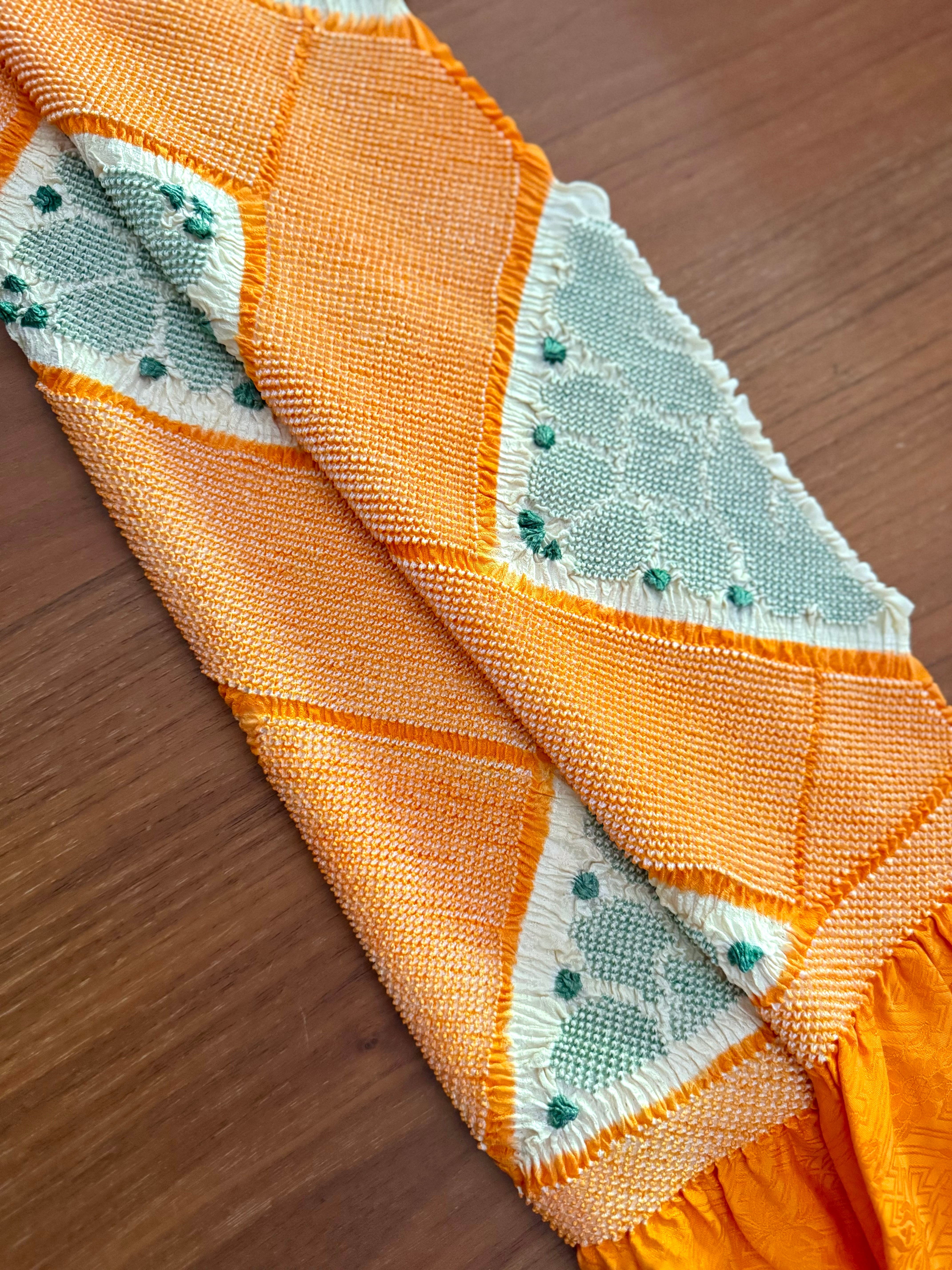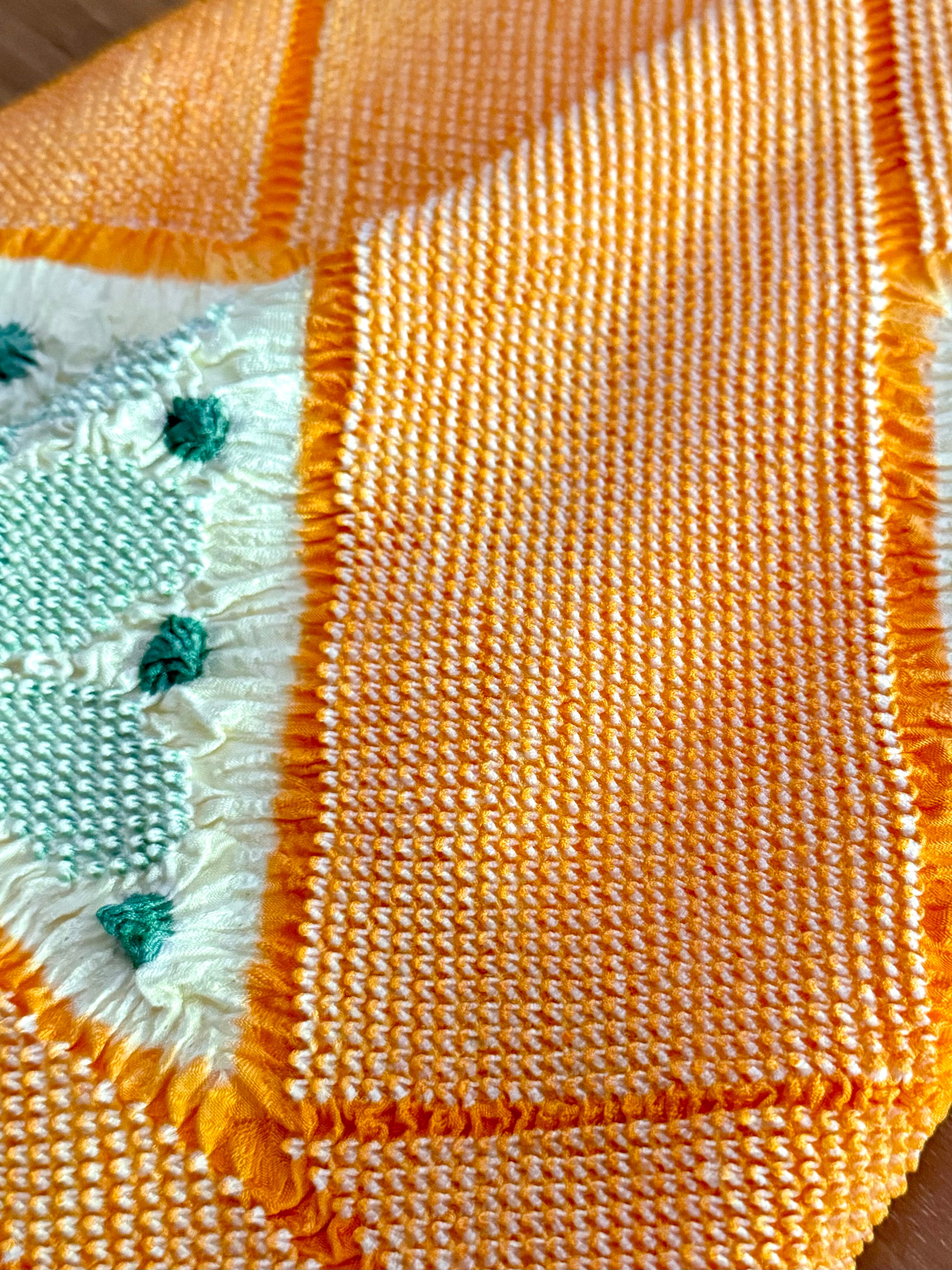 檜垣に牡丹柄 総絞り帯あげ 振袖用 橙色×緑青色